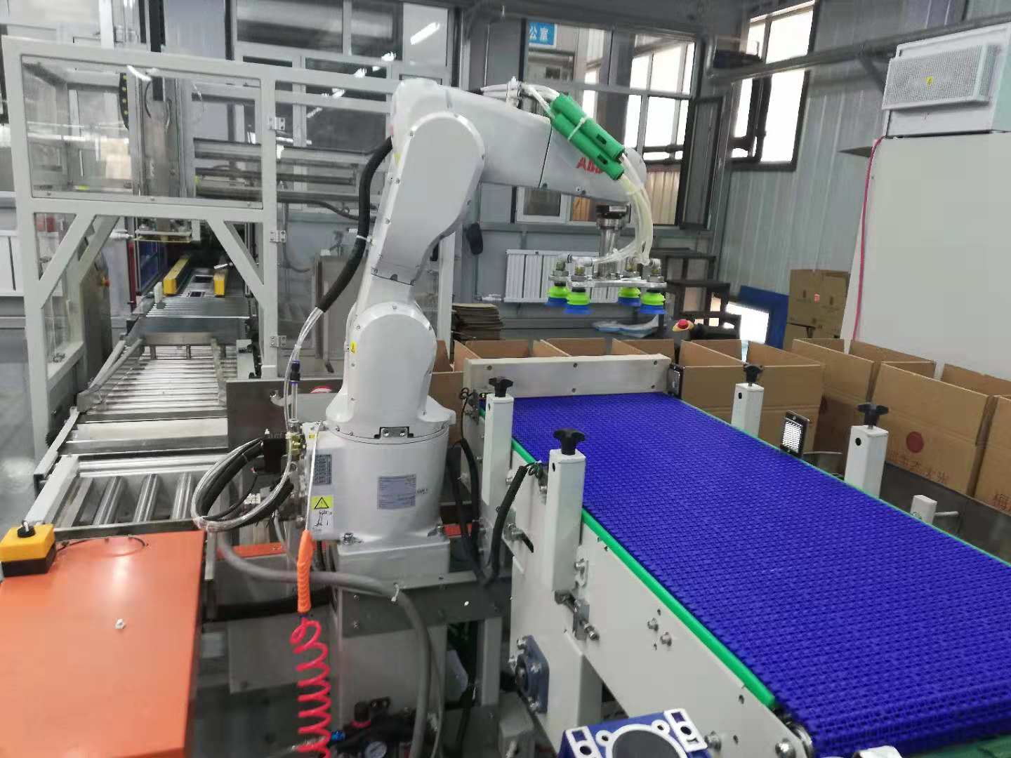 將產(chǎn)品通過(guò)進(jìn)料輸送帶輸送進(jìn)料,機(jī)器人及夾具到產(chǎn)品上方,抓取產(chǎn)品后移動(dòng)到裝箱位,按事先輸入的裝箱形式進(jìn)行產(chǎn)品裝箱。