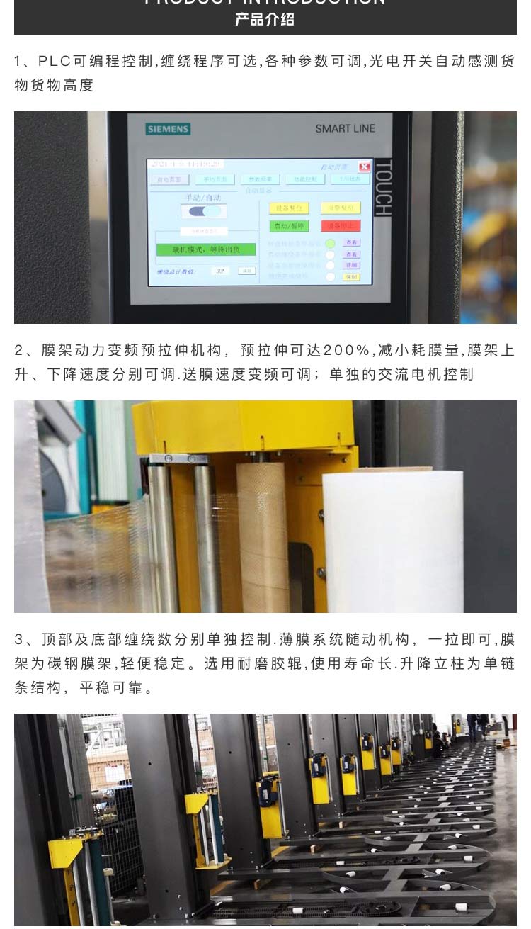 膜架動力變頻預拉伸機構,預拉伸可達200%,減小耗膜量。